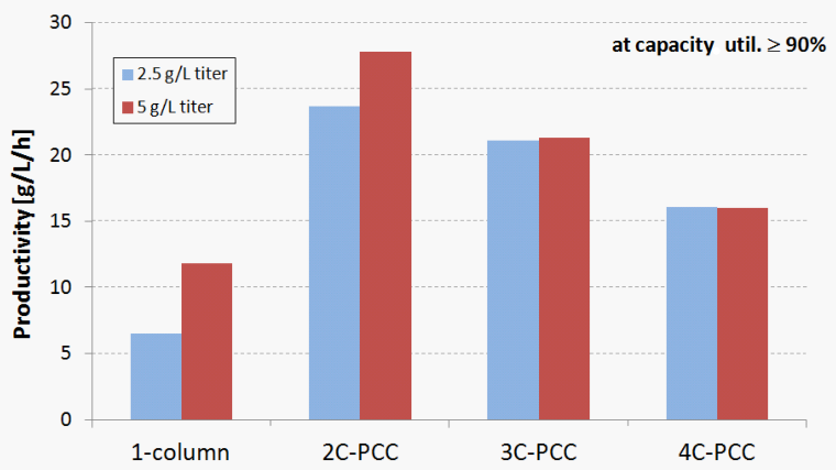 圖3.載量利用率> 90%的多柱位系統(tǒng)產(chǎn)量對比圖。其顯示了典型上樣濃度2.5 g/L和5 g/L的影響結(jié)果。2C-PCC比普通批處理和更復(fù)雜的3柱位、4柱位設(shè)計更具優(yōu)勢。*