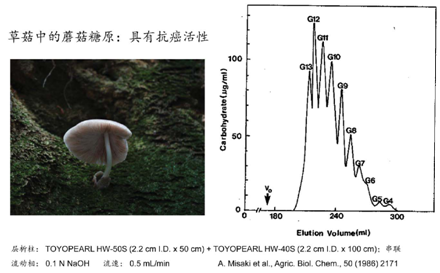 杏鮑菇 粗多糖 | DEAE-52(2.6×40cm) → Sephadex G-100 (1.3×50cm) | H2O,0.2,0.3,0.5M NaCl →H2O | 均一性多糖IPS-1和IPS-2 | |