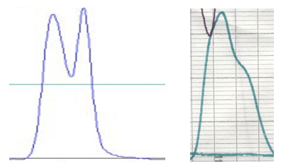 ? ? ? 可能原因:1)柱床中心凹陷,或柱床與篩網(wǎng)之間存有氣泡,導致樣品流動不均勻(樣品需要繞過凹陷區(qū)或氣泡);2)裝填不均勻,甚至內(nèi)部有裂縫;3)篩網(wǎng)堵塞,導致樣品流動不均勻;4)層析柱無分配器,或分配器設計不佳,導致偏流。