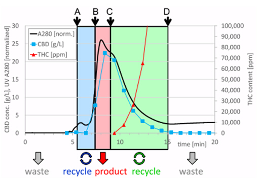 A:CBD濃度2.7 g/L(2,000 mAU)時開始進行回收(recycle);