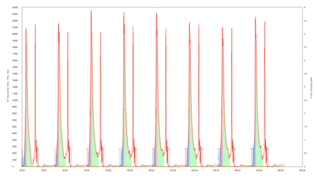 圖9各cycle重疊性良好,表明MCSGP功能運行穩(wěn)定,各cycle的產(chǎn)率、產(chǎn)品濃度及純度均保持穩(wěn)定。保留時間和峰形的變化由MControl自動補償,MControl根據(jù)紫外線閾值啟動CBD收集,當(dāng)紫外值降低至最大峰值90%時結(jié)束收集。