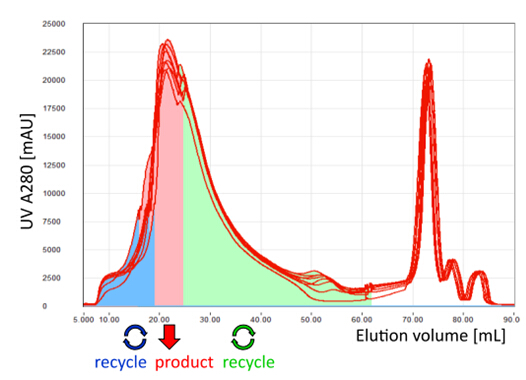 采用MCSGP,可將含有不純組分的產(chǎn)品回收再純化, 進行循環(huán)式的層析操作,從而最大限度地提純產(chǎn)品, 使得純度和收率二者兼得。
