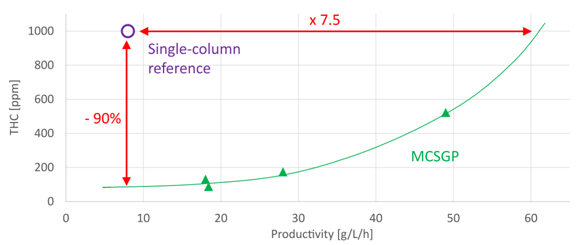 MCSGP可用于不同工藝要求。如果對目標產(chǎn)品的純度要求并不高,采用MCSGP可使產(chǎn)率進一步提高。比如某企業(yè)要求THC含量上限為1000 ppm時,收率水平不得低于85%,用MCSGP代替單柱層析后,產(chǎn)率由原來的8 g/L/h提高到了60 g/L/h以上。而另一工藝情況為,當(dāng)從單柱層析轉(zhuǎn)換為MCSGP時,保持產(chǎn)率不變,雜質(zhì)THC含量可從1000 ppm降低至100 ppm。見圖12純度 - 產(chǎn)率曲線。