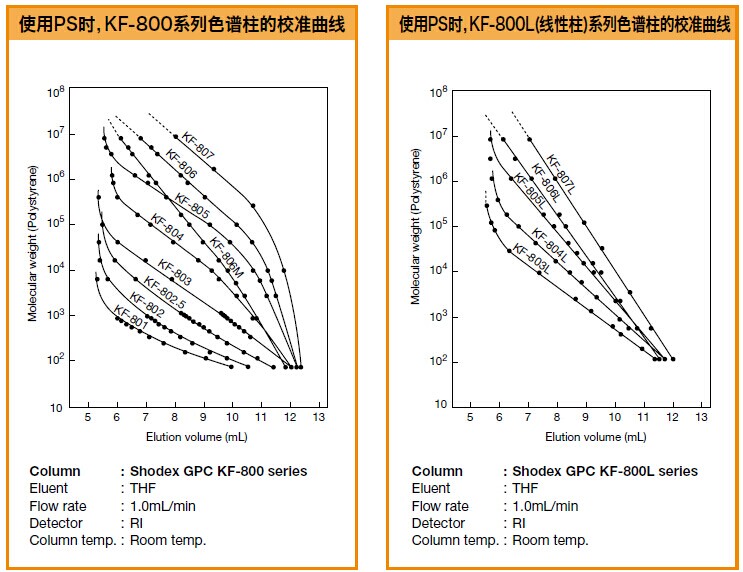GPC KF-804L是標準的油溶性SEC色譜柱,適用于從低分子量到高分子量的寬范圍的樣品。GPC KF-804L色譜柱是適合分子量分布廣的樣品的混合填料色譜柱。流動相是THF。