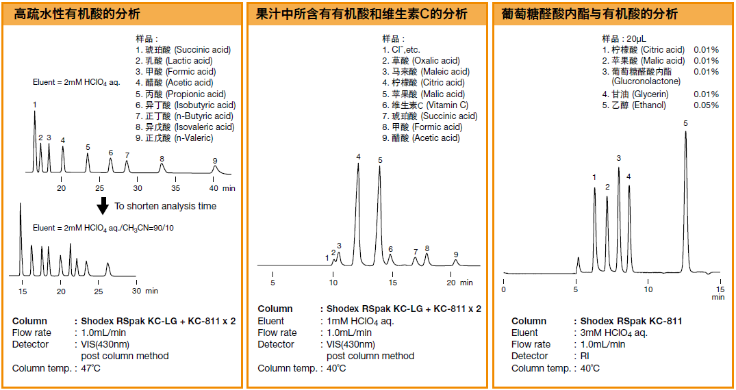 1. 離子排阻法進行有機酸分離。