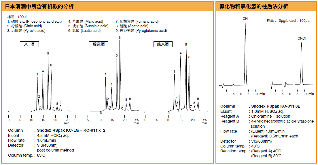 RSpak KC-811色譜柱是以聚苯乙烯-二乙烯基苯為基質的。它是用離子排阻法進行有機酸分離的色譜柱。可用于柱后法(post column method)進行高檢測靈敏度分析。