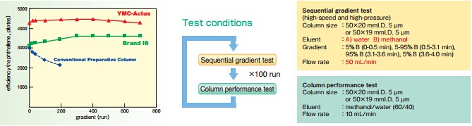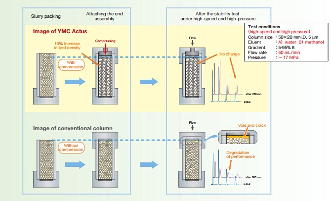 YMC-Actus具有高理論塔板數、高分離能的優點。即使在壓力變化很大的苛刻條件下也不會引起該性能的降低。