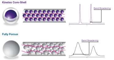 核-殼技術的奧秘在于核-殼顆粒的形狀。一致的多孔硅膠層圍繞著球形實心硅膠核生成:使用包含納米結構技術的溶膠凝膠處理技術,在固態硅膠核上培養出均一穩定的多孔外殼,形成核-殼顆粒。該顆粒形態會產生比全多孔顆粒更小的譜帶展寬,從而帶來極高的柱效。